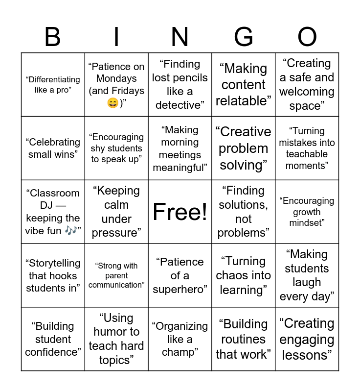 This bingo card has a free space and 40 words: Building strong relationships with students”, “Keeping calm under pressure”, “Finding the positive in every situation”, “Turning chaos into learning”, “Creating engaging lessons”, “Classroom DJ — keeping the vibe fun 🎶”, “Encouraging shy students to speak up”, “Making learning feel like a game”, “Creative problem solving”, “Making students laugh every day”, “Differentiating like a pro”, “Patience on Mondays (and Fridays 😄)”, “Organizing like a champ”, “Building routines that work”, “Encouraging growth mindset”, “Celebrating small wins”, “Strong classroom management”, “Finding lost pencils like a detective”, “Positive energy, even on tough days”, “Creating a safe and welcoming space”, “Storytelling that hooks students in”, “Using humor to teach hard topics”, “Making morning meetings meaningful”, “Finding solutions, not problems”, “Champion for every child”, “Team player and cheerleader”, “Quick on my feet”, “Using tech creatively”, “Master of transitions”, “Noticing the quiet kids”, “Classroom decorator extraordinaire ✨”, “Strong with parent communication”, “Patience of a superhero”, “Encouraging student independence”, “Turning mistakes into teachable moments”, “Building student confidence”, “Flexible and adaptable”, “Finding joy in the little things”, “Making content relatable” and “Always willing to learn and grow”.