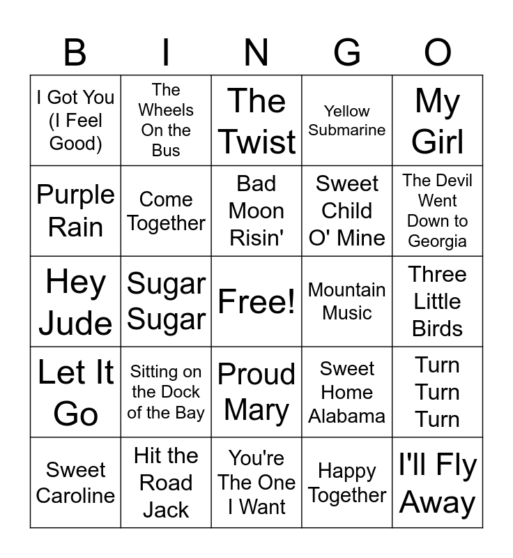 This bingo card has a free space and 40 words: Can't Help Falling in Love, Hey Jude, Folsom Prison Blues, Come Together, Hit the Road Jack, Proud Mary, Bad Moon Risin', Stand by Me, My Girl, Let It Go, Sugar Sugar, Yellow Submarine, I'll Fly Away, Three Little Birds, Mountain Music, Sitting on the Dock of the Bay, The Lion Sleeps Tonight, I Got You (I Feel Good), Don't Stop Believin', The Twist, Turn Turn Turn, Happy Together, Sweet Child O' Mine, Purple Rain, Country Roads Take Me Home, Joy to the World, My Guy, East Bound and Down, Take It Easy, I Will Survive, I Want It That Way, Sweet Caroline, Brown Eyed Girl, Sweet Home Alabama, The Devil Went Down to Georgia, You're The One I Want, Summer Nights, Love Shack, The Wheels On the Bus and Free Fallin'.