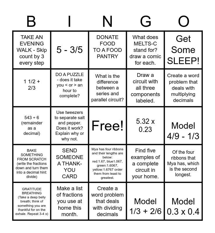 This bingo card has a free space and 24 words: SEND SOMEONE A THANK-YOU CARD, Make a list of fractions you use at home this month., What is the difference between a series and parallel circuit?, GRATITUDE BREATHING (Take a deep belly breath; think of something you are thankful for on the exhale. Repeat 3-4 x), Get Some SLEEP!, TAKE AN EVENING WALK - Skip count by 3 every step, 1 1/2 + 2/3, 5 - 3/5, 5.32 x 0.23, Mya has four ribbons and their lengths are below: red:1.67, blue1.067, green:1.6067, yellow:1.6767 order them from least to greatest., Draw a circuit with all three components labeled., 543 ÷ 6 (remainder as a decimal), Find five examples of a complete circuit in your home., Of the four ribbons that Mya has, which is the second longest., DO A PUZZLE - does it take you < or > an hour to complete?, Model 1/3 + 2/6, Model 4/9 - 1/3, DONATE FOOD TO A FOOD PANTRY, Create a word problem that deals with multiplying decimals, Use tweezers to separate salt and pepper. Does it work? Explain why or why not., Model 0.3 x 0.4, BAKE SOMETHING FROM SCRATCH (write the fractions down and turn them into a decimal hint: divide), What does MELTS-C stand for? draw a comic for each. and Create a word problem that deals with dividing decimals.