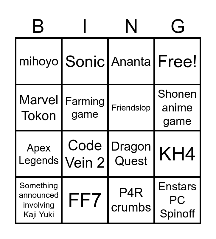 This bingo card has 16 words: FF7, KH4, Ananta, mihoyo, Apex Legends, Sonic, Dragon Quest, P4R crumbs, Marvel Tokon, Farming game, Something announced involving Kaji Yuki, Free!, Code Vein 2, Shonen anime game, Friendslop and Enstars PC Spinoff.