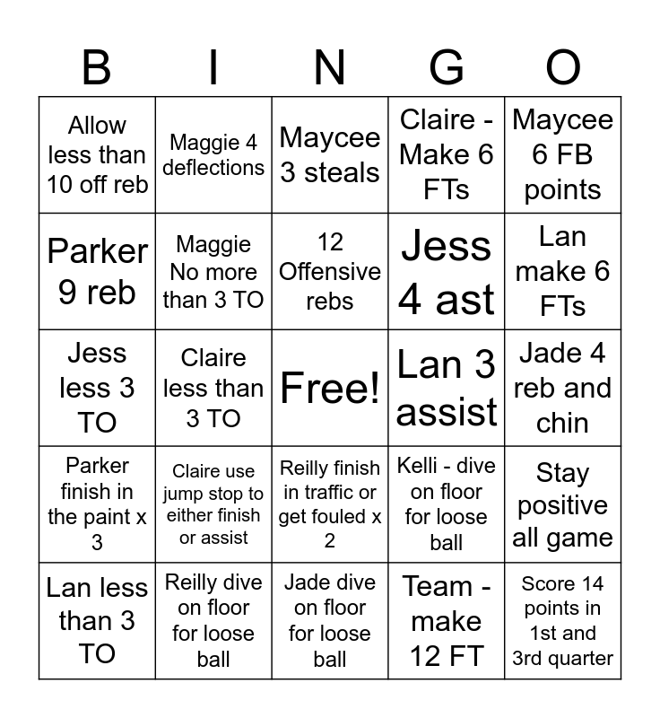 This bingo card has a free space and 24 words: Lan less than 3 TO, Claire use jump stop to either finish or assist, 12 Offensive rebs, Team - make 12 FT, Maycee 6 FB points, Allow less than 10 off reb, Maggie 4 deflections, Maycee 3 steals, Lan 3 assist, Jade 8 reb and chin, Jess less 3 TO, Maggie No more than 3 TO, Kelli - 1 deflection, Stay positive all game, Parker 9 reb, Reilly make 2 threes, Jade 3 drop step layups, Claire - Make 6 FTs, Lan make 6 FTs, Parker finish in the paint x 3, Claire less than 3 TO, Reilly finish in traffic or get fouled x 2, Jess 4 ast and Score 14 points in 1st and 3rd quarter.