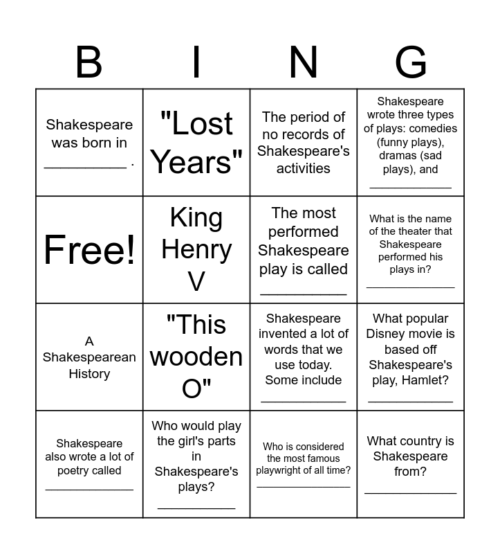 This bingo card has 41 words: How many plays did Shakespeare write in his life?__________, Shakespeare invented a lot of words that we use today. Some include ____________, Shakespeare invented a lot of phrases that we use today. Some include ____________, The most performed Shakespeare play is called __________, True or false. Both men and women acted in Shakespeare’s plays. _____________, The ___________ caused all the theaters to close in London., What is the name of the theater that Shakespeare performed his plays in? _______________, Shakespeare’s acting troupe was called the _____________., Free!, What country is Shakespeare from? _____________, What popular Disney movie is based off Shakespeare's play, Hamlet? ____________, Shakespeare wrote three types of plays: comedies (funny plays), dramas (sad plays), and _____________, Shakespeare also wrote a lot of poetry called ______________, Who is considered the most famous playwright of all time? _________________, Who would play the girl's parts in Shakespeare's plays? ___________, Shakespeare's plays were written in a type of poetry called _________, Shakespeare would often play for famous people including ___________, Shakespeare was born in __________ ., Married at age 18 to _________., The period of no records of Shakespeare's activities, Shakespeare's company of players, A Shakespearean Comedy, A Shakespearean Tragedy, A Shakespearean History, The estimated vocabulary of Shakespeare, The age of Shakespeare's death, Renaissance or the Elizabethan Age, Caused Hamnet's death, "This wooden O", Stratford-Upon-Avon, England, Anne Hathaway, "Lost Years", King's Men, Taming of the Shrew, Macbeth, King Henry V, Between 17,000 and 34,000, 52 years old, Time in which Shakespeare lived/wrote, Bubonic Plague and The Globe.