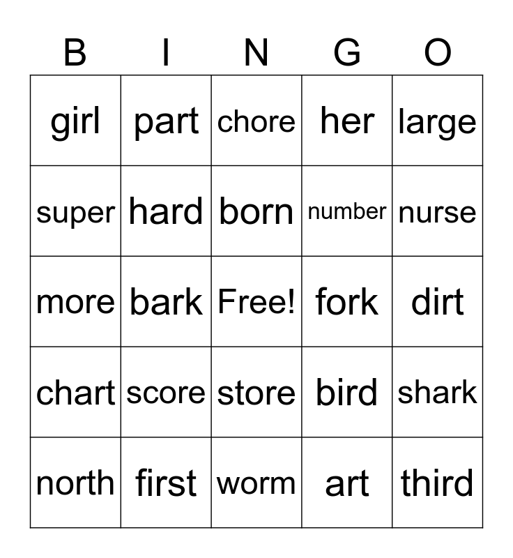 This bingo card has a free space and 32 words: art, yard, bark, car, chart, hard, large, shark, part, smart, born, chore, cord, for, fork, horse, north, more, store, score, bird, curb, dirt, first, third, her, number, super, girl, worm, word and nurse.