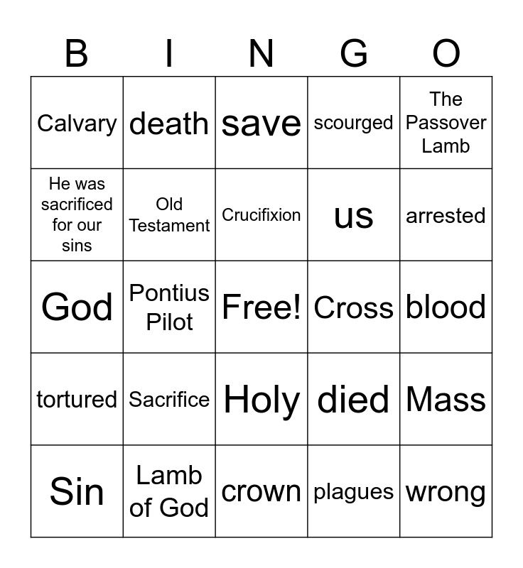 This bingo card has a free space and 24 words: Sacrifice, Lamb of God, Crucifixion, Sin, The Passover Lamb, Calvary, He was sacrificed for our sins, death, Cross, Holy, us, God, died, Mass, Old Testament, plagues, blood, save, arrested, Pontius Pilot, wrong, tortured, scourged and crown.