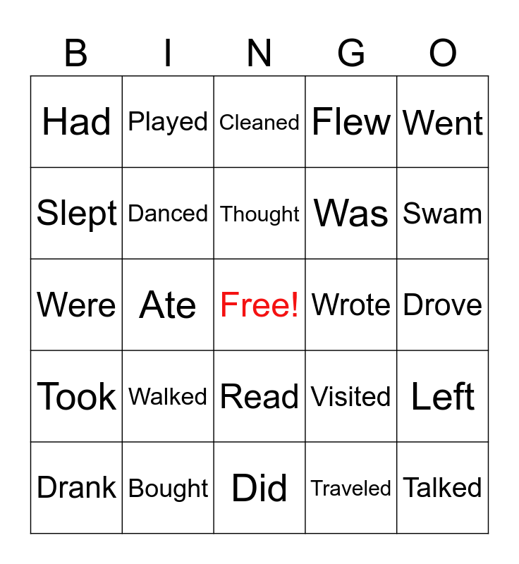 This bingo card has a free space and 24 words: Walked, Bought, Thought, Drank, Went, Had, Slept, Played, Wrote, Read, Was, Were, Visited, Left, Danced, Traveled, Drove, Cleaned, Swam, Ate, Talked, Took, Flew and Did.