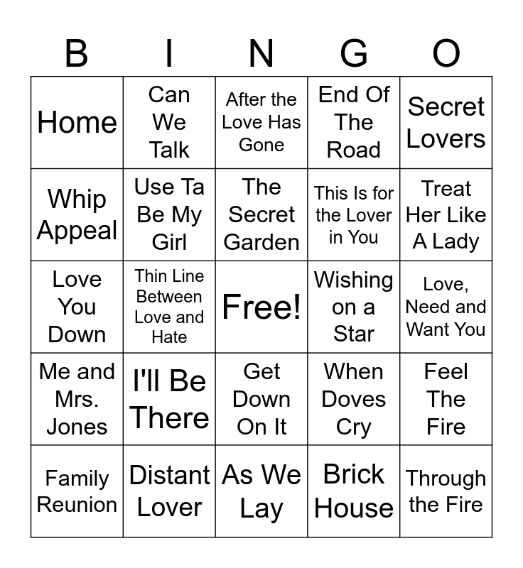 This bingo card has a free space and 29 words: Family Reunion, Fire And Desire, Thin Line Between Love and Hate, Electric Slide, Home, After the Love Has Gone, Use Ta Be My Girl, I'll Be There, Wishing on a Star, Distant Lover, Love, Need and Want You, Through the Fire, As We Lay, Brick House, Treat Her Like A Lady, Thanks for My Child, Get Down On It, Me and Mrs. Jones, Secret Lovers, Love You Down, When Doves Cry, Let's Hear It For the Boy, This Is for the Lover in You, Whip Appeal, End Of The Road, Can We Talk, Feel The Fire, The Secret Garden and Diamond and Pearls.
