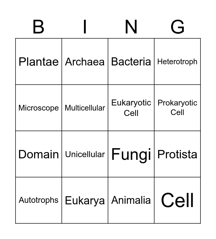 This bingo card has 16 words: Eukarya, Protista, Bacteria, Plantae, Domain, Archaea, Fungi, Animalia, Microscope, Multicellular, Autotrophs, Heterotroph, Unicellular, Prokaryotic Cell, Eukaryotic Cell and Cell.