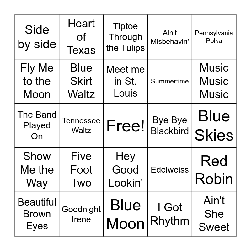 This bingo card has a free space and 41 words: Alexander's Ragtime Band, The Band Played On, Beer Barrel Polka, Blue Skirt Waltz, Goodnight Irene, Hey Good Lookin', Meet me in St. Louis, Missouri Waltz, Pennsylvania Polka, Show Me the Way, Tennessee Waltz, Ain't Misbehavin', Ain't She Sweet, Blue Skies, Bye Bye Blackbird, Five Foot Two, Four Leaf Clover, Side by side, Singin' in the Rain, Tiptoe Through the Tulips, Red Robin, All of Me, Blue Moon, Summertime, You Are My Sunshine, Don't Fence Me In, I Got Rhythm, Too Ra Loo Ra, Music Music Music, Sentimental Journey, Don't Sit Under the Apple Tree, Heart of Texas, Beautiful Brown Eyes, Blueberry Hill, Edelweiss, Fly Me to the Moon, A Bushel and a Peck, Happy Trails, Unforgettable, Yellow Rose of Texas and Que Sera.
