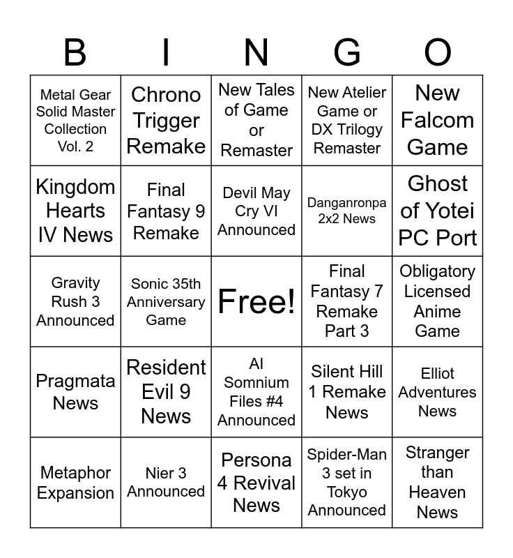 This bingo card has a free space and 24 words: Resident Evil 9 News, Nier 3 Announced, Devil May Cry VI Announced, Metaphor Expansion, New Falcom Game, Metal Gear Solid Master Collection Vol. 2, Kingdom Hearts IV News, Chrono Trigger Remake, Final Fantasy 7 Remake Part 3, AI Somnium Files #4 Announced, Danganronpa 2x2 News, Gravity Rush 3 Announced, Silent Hill 1 Remake News, Elliot Adventures News, Final Fantasy 9 Remake, Spider-Man 3 set in Tokyo Announced, Obligatory Licensed Anime Game, New Tales of Game or Remaster, Ghost of Yotei PC Port, Sonic 35th Anniversary Game, Stranger than Heaven News, Pragmata News, New Atelier Game or DX Trilogy Remaster and Persona 4 Revival News.