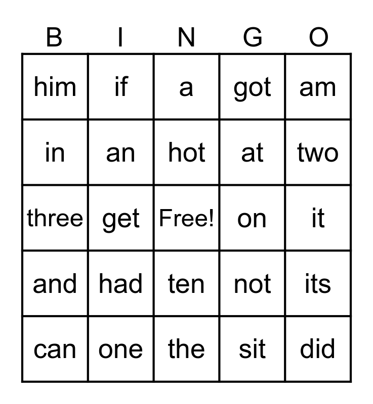 This bingo card has a free space and 24 words: can, had, hot, sit, am, him, if, a, on, it, three, an, not, its, in, one, the, got, two, and, get, ten, at and did.