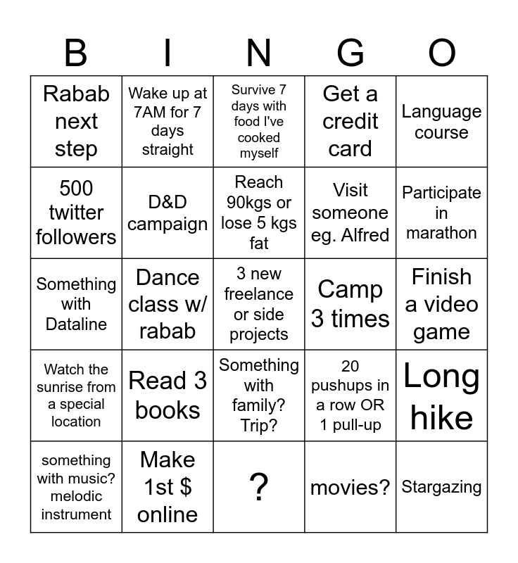 This bingo card has a free space and 24 words: Read 3 books, Make 1st $ online, Reach 90kgs or lose 5 kgs fat, something with music? melodic instrument, Language course, Rabab next step, 500 twitter followers, Wake up at 7AM for 7 days straight, Camp 3 times, Something with family? Trip?, Visit someone eg. Alfred, Something with Dataline, 20 pushups in a row OR 1 pull-up, Long hike, D&D campaign, movies?, Finish a video game, Survive 7 days with food I've cooked myself, Participate in marathon, Dance class w/ rabab, Stargazing, Watch the sunrise from a special location, Get a credit card and ?.