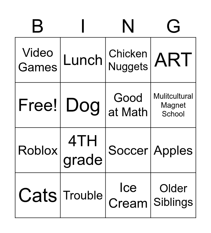 This bingo card has 16 words: Trouble, Apples, Chicken Nuggets, Video Games, Roblox, Lunch, Soccer, Ice Cream, Free!, Dog, Cats, ART, 4TH grade, Mulitcultural Magnet School, Good at Math and Older Siblings.