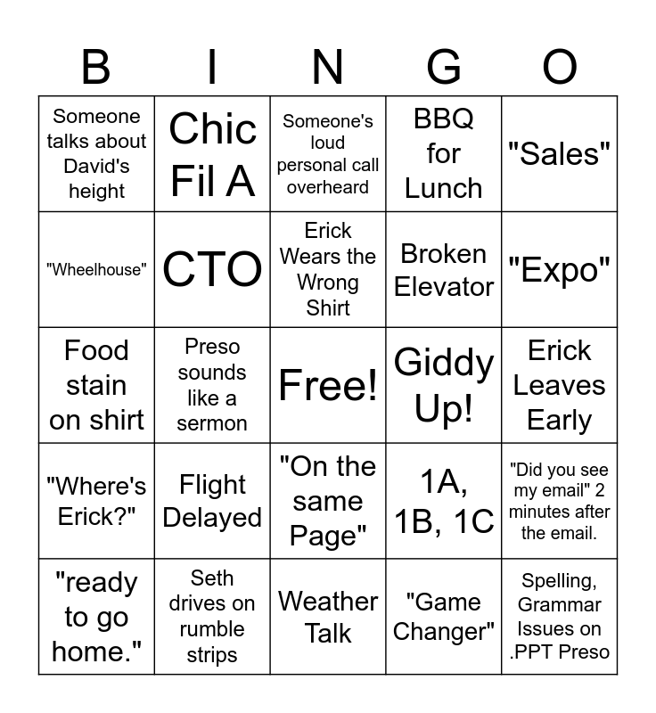 This bingo card has a free space and 24 words: Flight Delayed, Seth drives on rumble strips, Erick Wears the Wrong Shirt, "ready to go home.", "Sales", Someone talks about David's height, "Wheelhouse", Chic Fil A, Giddy Up!, "On the same Page", Broken Elevator, Food stain on shirt, 1A, 1B, 1C, "Did you see my email" 2 minutes after the email., CTO, "Game Changer", Erick Leaves Early, Someone's loud personal call overheard, "Expo", Preso sounds like a sermon, Spelling, Grammar Issues on .PPT Preso, "Where's Erick?", BBQ for Lunch and Weather Talk.