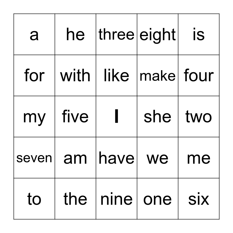 This bingo card has a free space and 24 words: am, the, like, to, is, a, for, he, she, have, make, my, we, me, with, one, two, three, four, five, six, seven, eight and nine.