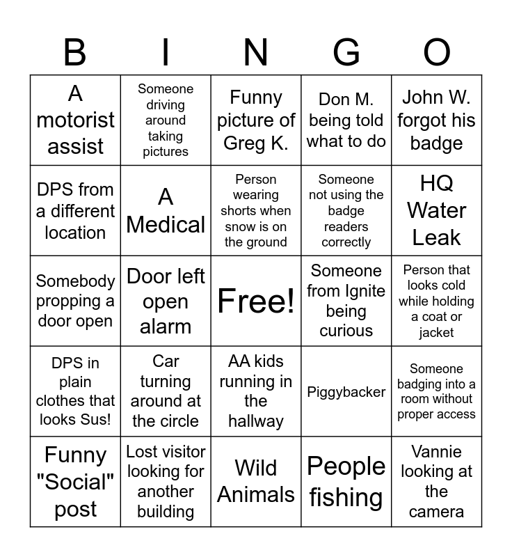 This bingo card has a free space and 24 words: Car turning around at the circle, Lost visitor looking for another building, Person wearing shorts when snow is on the ground, Funny "Social" post, John W. forgot his badge, A motorist assist, DPS from a different location, Someone driving around taking pictures, Someone from Ignite being curious, AA kids running in the hallway, Someone not using the badge readers correctly, Somebody propping a door open, Piggybacker, Someone badging into a room without proper access, A Medical, People fishing, Person that looks cold while holding a coat or jacket, Funny picture of Greg K., HQ Water Leak, Door left open alarm, Vannie looking at the camera, DPS in plain clothes that looks Sus!, Don M. being told what to do and Wild Animals.