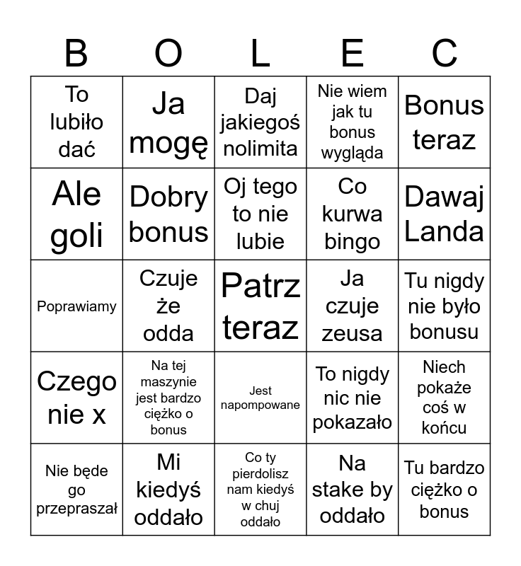 This bingo card has 25 words: Na tej maszynie jest bardzo ciężko o bonus, Co ty pierdolisz nam kiedyś w chuj oddało, Oj tego to nie lubie, Nie będe go przepraszał, Bonus teraz, To lubiło dać, Ale goli, Ja mogę, Ja czuje zeusa, Jest napompowane, Co kurwa bingo, Poprawiamy, To nigdy nic nie pokazało, Niech pokaże coś w końcu, Dobry bonus, Tu bardzo ciężko o bonus, Tu nigdy nie było bonusu, Daj jakiegoś nolimita, Dawaj Landa, Czuje że odda, Patrz teraz, Mi kiedyś oddało, Czego nie x, Nie wiem jak tu bonus wygląda and Na stake by oddało.