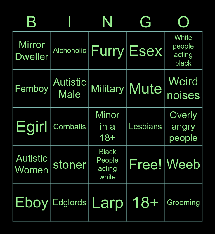 This bingo card has 25 words: stoner, Larp, Military, Eboy, White people acting black, Mirror Dweller, Femboy, Alchoholic, Lesbians, Black People acting white, Mute, Egirl, Free!, Weeb, Autistic Male, Grooming, Overly angry people, Furry, Weird noises, Cornballs, Minor in a 18+, Edglords, Autistic Women, Esex and 18+.