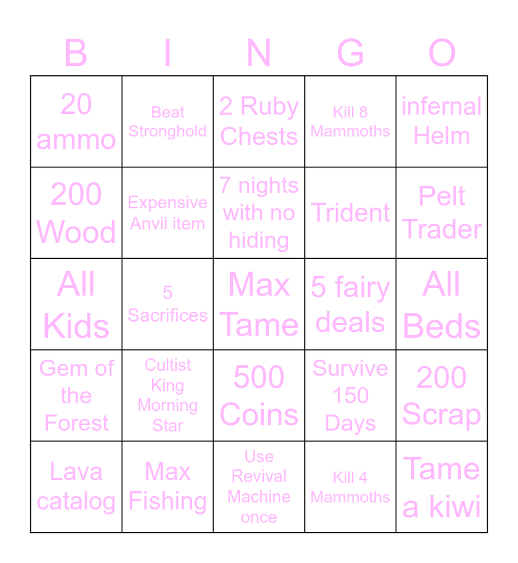 This bingo card has 25 words: Cultist King Morning Star, Use Revival Machine once, 7 nights with no hiding, Lava catalog, infernal Helm, 20 ammo, 200 Wood, Beat Stronghold, 5 fairy deals, 500 Coins, Trident, All Kids, Survive 150 Days, 200 Scrap, Expensive Anvil item, Tame a kiwi, All Beds, 2 Ruby Chests, Pelt Trader, 5 Sacrifices, Max Tame, Max Fishing, Gem of the Forest, Kill 8 Mammoths and Kill 4 Mammoths.