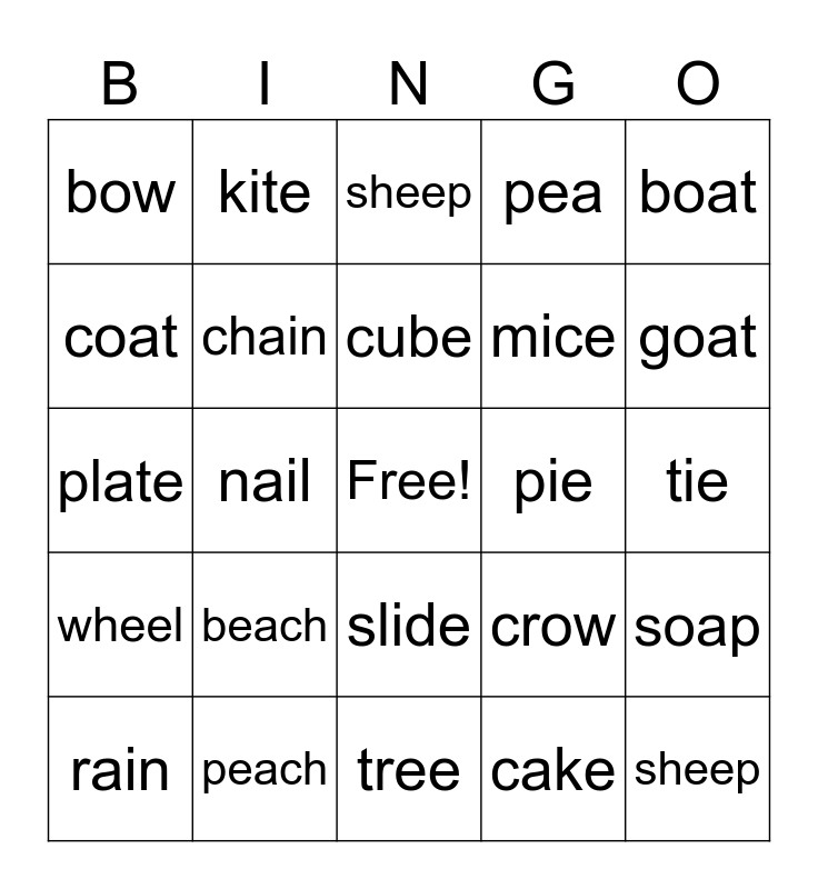 This bingo card has a free space and 29 words: rain, bride, nail, bone, bow, sheep, chain, beach, pie, peach, tie, sheep, tree, cake, goat, five, slide, wheel, boat, plate, crow, gate, mice, coat, pea, kite, soap, cube and rake.