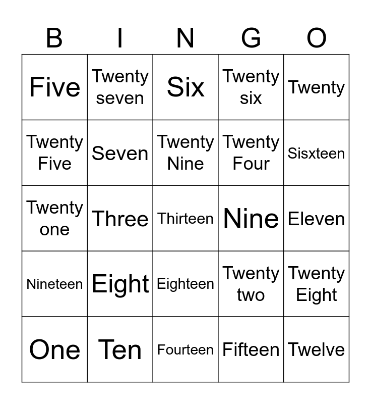 This bingo card has a free space and 29 words: One, Two, Three, Four, Five, Six, Seven, Eight, Nine, Ten, Eleven, Twelve, Fourteen, Fifteen, Sisxteen, Seventeen, Eighteen, Nineteen, Twenty, Twenty one, Twenty two, Twenty three, Twenty Four, Twenty Five, Twenty six, Twenty seven, Twenty Eight, Twenty Nine and Thirty.