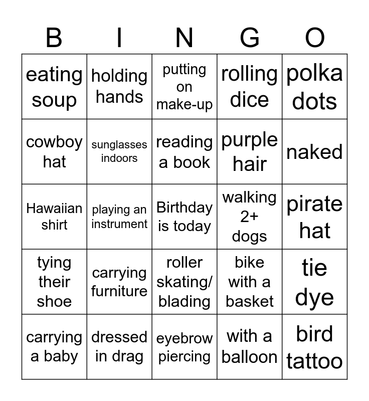 This bingo card has a free space and 24 words: carrying furniture, dressed in drag, reading a book, carrying a baby, polka dots, eating soup, cowboy hat, holding hands, walking 2+ dogs, roller skating/ blading, purple hair, Hawaiian shirt, bike with a basket, tie dye, sunglasses indoors, with a balloon, pirate hat, putting on make-up, naked, playing an instrument, bird tattoo, tying their shoe, rolling dice and eyebrow piercing.