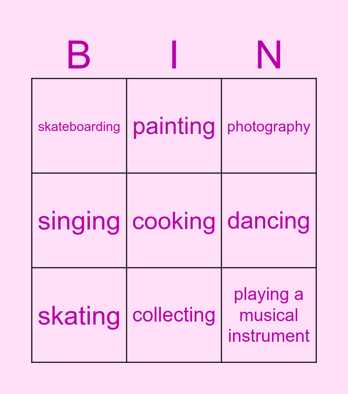 This bingo card has a free space and 8 words: dancing, photography, painting, skating, skateboarding, playing a musical instrument, singing and collecting.
