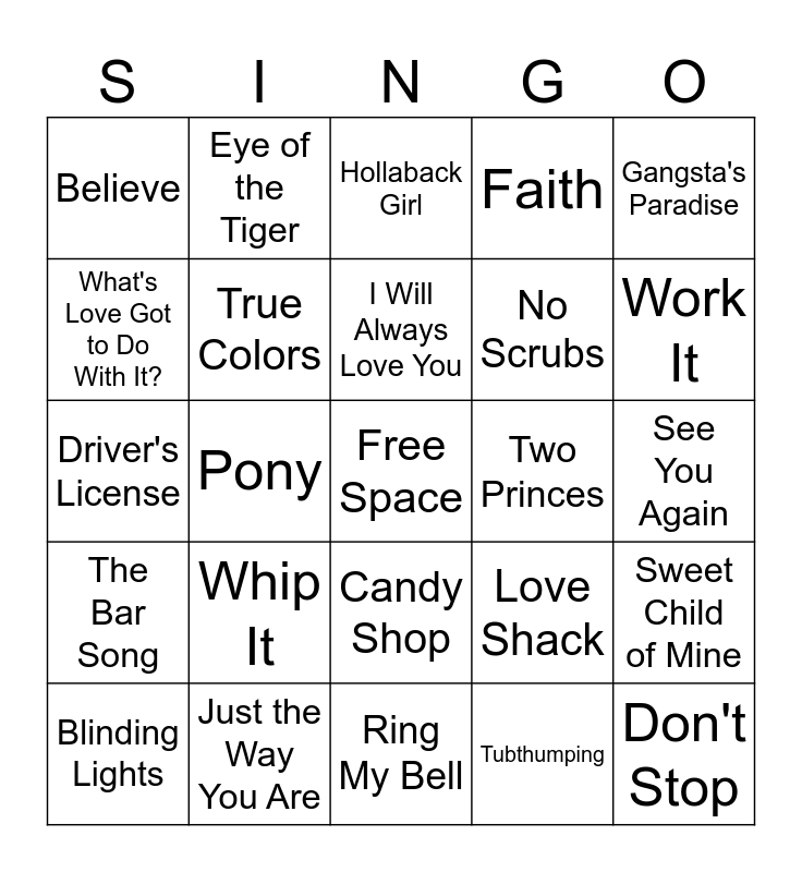 This bingo card has a free space and 50 words: Play That Funky Music, Don't Stop, I Will Survive, Ring My Bell, Whip It, Jessie's Girl, Eye of the Tiger, Every Breath You Take, What's Love Got to Do With It?, Take On Me, True Colors, Faith, Sweet Child of Mine, Love Shack, Ice Ice Baby, (Everything I Do) I Do It For You, I Will Always Love You, Two Princes, I'll Make Love to You, Gangsta's Paradise, Pony, Tubthumping, Believe, No Scrubs, Hanging by a Moment, Fallin', Work It, Stacy's Mom, Hollaback Girl, Candy Shop, Bad Day, Umbrella, Viva La Vida, Use Somebody, Just the Way You Are, Rolling in the Deep, Call Me Maybe, Happy, Shake It Off, See You Again, Can't Stop the Feeling!, Despacito, Old Town Road, Seniorita, Blinding Lights, Driver's License, We Don't Talk About Bruno, Flowers, The Bar Song and Manchild.