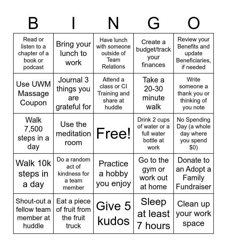 This bingo card has a free space and 24 words: Do a random act of kindness for a team member, Eat a piece of fruit from the fruit truck, Attend a class or CI Training and share at huddle, Shout-out a fellow team member at huddle, Review your Benefits and update Beneficiaries, if needed, Read or listen to a chapter of a book or podcast, Use UWM Massage Coupon, Bring your lunch to work, Drink 2 cups of water or a full water bottle at work, Practice a hobby you enjoy, Take a 20-30 minute walk, Walk 7,500 steps in a day, Go to the gym or work out at home, Donate to an Adopt a Family Fundraiser, Journal 3 things you are grateful for, Sleep at least 7 hours, No Spending Day (a whole day where you spend $0), Have lunch with someone outside of Team Relations, Write someone a thank you or thinking of you note, Use the meditation room, Clean up your work space, Walk 10k steps in a day, Create a budget/track your finances and Give 5 kudos.