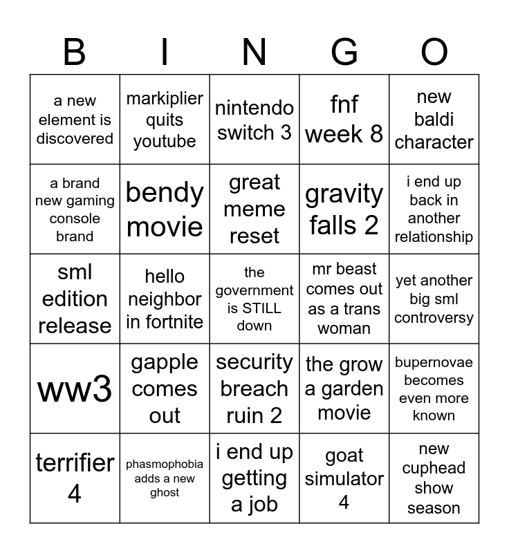 This bingo card has a free space and 39 words: Donald trump dies, gta 6, dream dies, bendy movie, terrifier 4, security breach ruin 2, great meme reset, steal a brainrot goes bankrupt, new baldi character, ww3, hello neighbor in fortnite, fnf week 8, new cuphead show season, yet another big sml controversy, mr beast comes out as a trans woman, gapple comes out, poppy playtime 5, a new element is discovered, fnaf movie 3 announced, the grow a garden movie, a brand new gaming console brand, i end up getting a job, gravity falls 2, i end up back in another relationship, 6 7 becomes irrelevant, irida comes back, kinito pet 2, purple tooth demo, sweeth tooth v2, markiplier quits youtube, sweet tooth reboot, mr beast gets one billion dollars, nintendo switch 3, phasmophobia adds a new ghost, goat simulator 4, fortnite fnaf collab, bupernovae becomes even more known, sml edition release and among us show finally comes out.