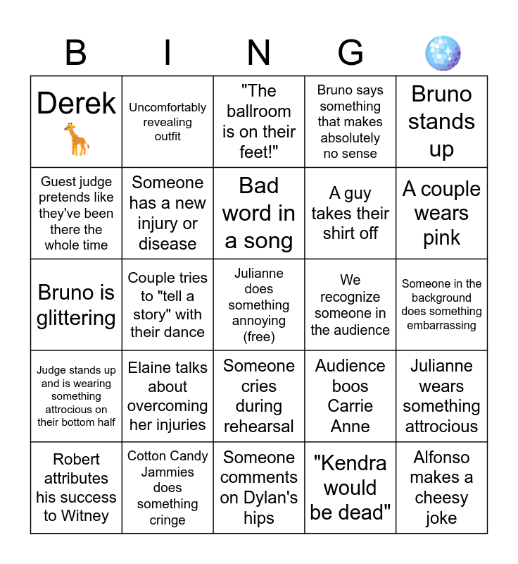 This bingo card has a free space and 24 words: Elaine talks about overcoming her injuries, Cotton Candy Jammies does something cringe, Bad word in a song, Robert attributes his success to Witney, Bruno stands up, Derek 🦒, Guest judge pretends like they've been there the whole time, Uncomfortably revealing outfit, We recognize someone in the audience, Someone cries during rehearsal, A guy takes their shirt off, Bruno is glittering, Audience boos Carrie Anne, Julianne wears something attrocious, Someone has a new injury or disease, "Kendra would be dead", Someone in the background does something embarrassing, "The ballroom is on their feet!", A couple wears pink, Couple tries to "tell a story" with their dance, Alfonso makes a cheesy joke, Judge stands up and is wearing something attrocious on their bottom half, Bruno says something that makes absolutely no sense and Someone comments on Dylan's hips.