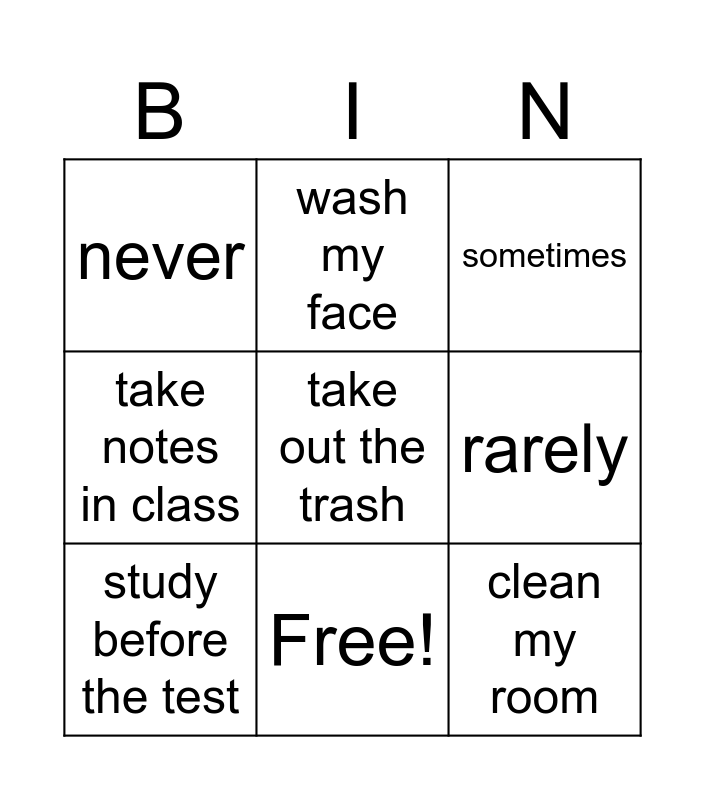 This bingo card has 17 words: always, usually, sometimes, never, Free!, rarely, generally, take out the trash, clean my room, study before the test, brush my test, meet my friends, take notes in class, wash my face, do my homework, be on time and make my bed.