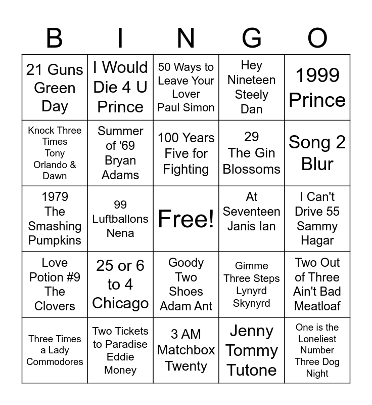 This bingo card has a free space and 32 words: Jenny Tommy Tutone, Eight Days a Week Paul McCartney, 99 Luftballons Nena, Edge of Seventeen Stevie Nicks, Love Potion #9 The Clovers, Summer of '69 Bryan Adams, 1999 Prince, Two Out of Three Ain't Bad Meatloaf, I Would Die 4 U Prince, Mambo No. 5 Lou Bega, 100 Years Five for Fighting, 50 Ways to Leave Your Lover Paul Simon, One Way or Another Blondie, I'm Gonna Be (500 Miles) The Proclaimers, At Seventeen Janis Ian, 9 to 5 Dolly Parton, Three Times a Lady Commodores, 1979 The Smashing Pumpkins, Goody Two Shoes Adam Ant, 25 or 6 to 4 Chicago, Gimme Three Steps Lynyrd Skynyrd, December 1963 Frankie Valli & The Four Seasons, I Can't Drive 55 Sammy Hagar, Two Tickets to Paradise Eddie Money, One is the Loneliest Number Three Dog Night, Hey Nineteen Steely Dan, 29 The Gin Blossoms, Knock Three Times Tony Orlando & Dawn, 21 Guns Green Day, 3 AM Matchbox Twenty, Fifteen Taylor Swift and Song 2 Blur.