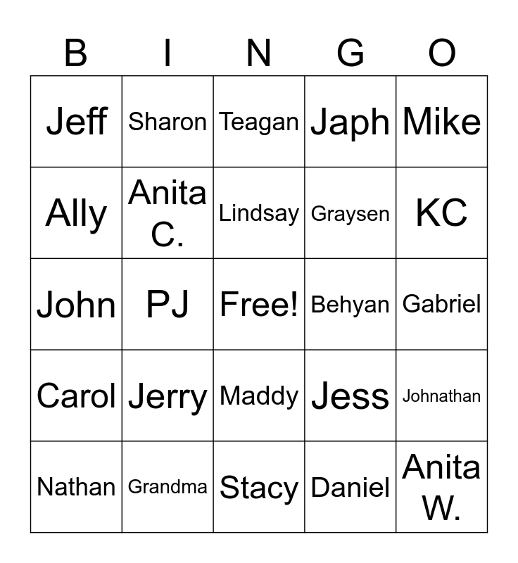 This bingo card has a free space and 62 words: Pappy, Grandma, Steve, Carol, Craig, Brenda, Anita C., Gryphon, Graysen, McKenna, Japh, Amber, Ally, Sandra, Dean, Jeff, Anita W., Mike, Seth, Lindsay, Behyan, Teagan, Nathan, Daniel, Chris, Joni, Cam, Becca, Johnathan, Kasey, Courtney, Ronald, Savannah, Kinsey, Gabriel, Sharon, Barry, DeiDei, PJ, Tehya, John, Sally, Jerry, Heather, KC, Jess, Isaac, Carter, Quincy, Danyl, Maddy, Stacy, Kevin, Tanner, Natalie, dishwasher, merry go round, The Ridge, record player, truck patch, feed sacks and 1938.