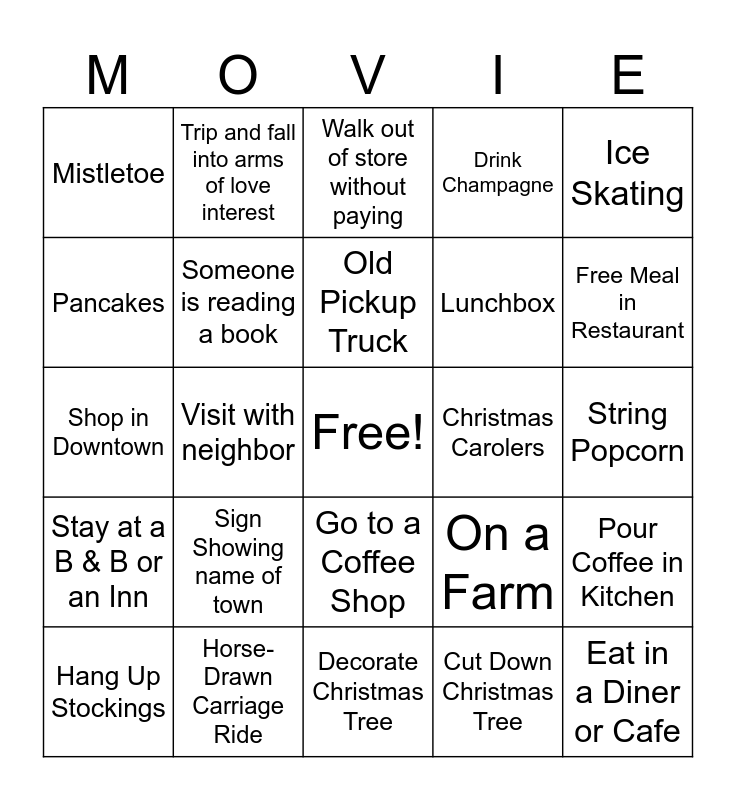This bingo card has a free space and 44 words: Bake Cookies, Eat in a Diner or Cafe, New York City, Hang Up Stockings, Eggnog, Cut Down Christmas Tree, Walk out of store without paying, Drink Wine, Ice Skating, Horse-Drawn Carriage Ride, Drink Champagne, Christmas Carolers, Go to a Coffee Shop, Sign Showing name of town, Folgers Coffee, Decorate Christmas Tree, Dancing, Shop in Downtown, Phone Call With Parents, Free Meal in Restaurant, Trip and fall into arms of love interest, Make Gingerbread Houses, Hold an ornament and have a faraway look, Mistletoe, Hang a Christmas Wreath, String Popcorn, Sit by a Fire (You know, a big, hot flame), A Dog, On a Farm, Stay at a B & B or an Inn, Swimming Pool, Pour Coffee in Kitchen, Evening Gown, Santa Claus, Visit with neighbor, View of Mountains, For Sale Sign, Bake a Turkey, Old Pickup Truck, Pancakes, Lunchbox, It's A Wonderful Life Movie, Someone is reading a book and Wrap Up in a Christmas Blanket While Sitting on Couch.