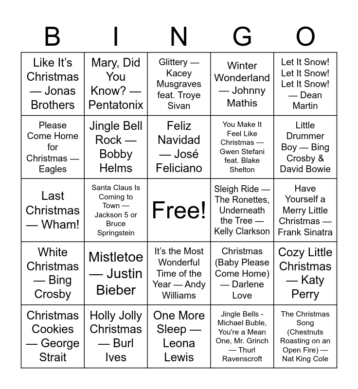 This bingo card has a free space and 41 words: All I Want for Christmas Is You — Mariah Carey, Last Christmas — Wham!, Rockin’ Around the Christmas Tree — Brenda Lee, Jingle Bell Rock — Bobby Helms, Holly Jolly Christmas — Burl Ives, It’s the Most Wonderful Time of the Year — Andy Williams, Feliz Navidad — José Feliciano, Rudolph the Red-Nosed Reindeer — Gene Autry, Let It Snow! Let It Snow! Let It Snow! — Dean Martin, White Christmas — Bing Crosby, Santa Claus Is Coming to Town — Jackson 5 or Bruce Springstein, Winter Wonderland — Johnny Mathis, The Christmas Song (Chestnuts Roasting on an Open Fire) — Nat King Cole, Have Yourself a Merry Little Christmas — Frank Sinatra, Sleigh Ride — The Ronettes, Underneath the Tree — Kelly Clarkson, Mistletoe — Justin Bieber, Santa Tell Me — Ariana Grande, Like It’s Christmas — Jonas Brothers, Christmas Tree Farm — Taylor Swift, Glittery — Kacey Musgraves feat. Troye Sivan, Cozy Little Christmas — Katy Perry, Oh Santa! — Mariah Carey, Ariana Grande & Jennifer Hudson, One More Sleep — Leona Lewis, You Make It Feel Like Christmas — Gwen Stefani feat. Blake Shelton, Candy Cane Lane - Sia, Christmas (Baby Please Come Home) - Mariah Carey, Jingle Bells - Michael Buble, You're a Mean One, Mr. Grinch — Thurl Ravenscroft, The Chipmunk Song (Christmas Don’t Be Late) — Alvin & The Chipmunks, Little Drummer Boy — Bing Crosby & David Bowie, Carol of the Bells — Trans-Siberian Orchestra, Run Rudolph Run — Chuck Berry, Hallelujah — Pentatonix, Mary, Did You Know? — Pentatonix, Christmas Cookies — George Strait, Tennessee Christmas — Amy Grant, Christmas (Baby Please Come Home) — Darlene Love, Please Come Home for Christmas — Eagles, Blue Christmas — Elvis Presley, Do They Know It’s Christmas? — Band Aid, Wonderful Christmastime — Paul McCartney, Happy Xmas (War Is Over) — John Lennon & Yoko Ono and Christmas All Over Again - Tom Petty.