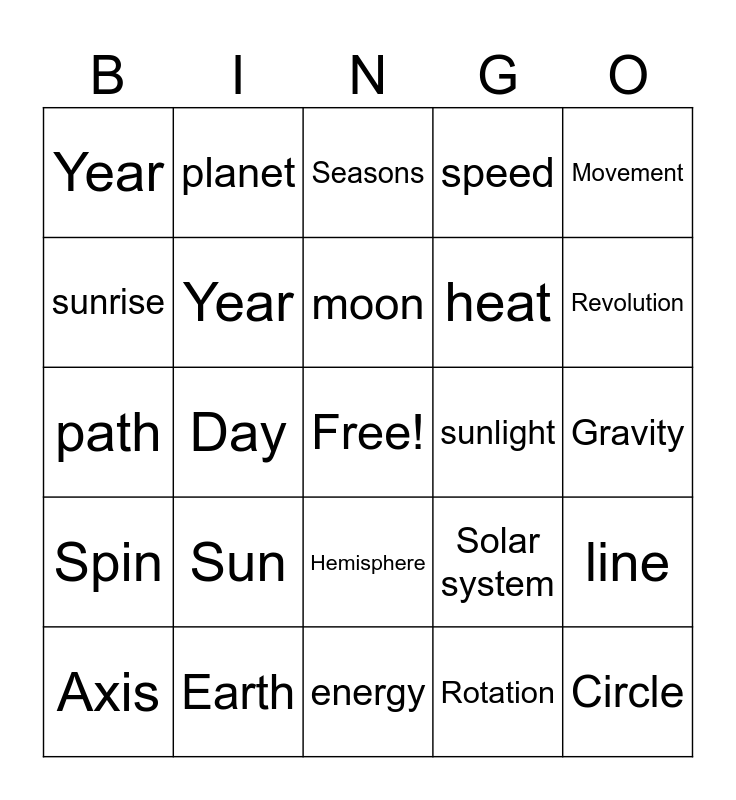 This bingo card has a free space and 29 words: Axis, Orbit, Day, Night, Year, Seasons, Year, Sun, sunlight, Earth, Gravity, Circle, energy, Rotation, Revolution, Eclipse, Hemisphere, Spin, Movement, path, Solar system, light, heat, sunrise, speed, planet, line, moon and period.