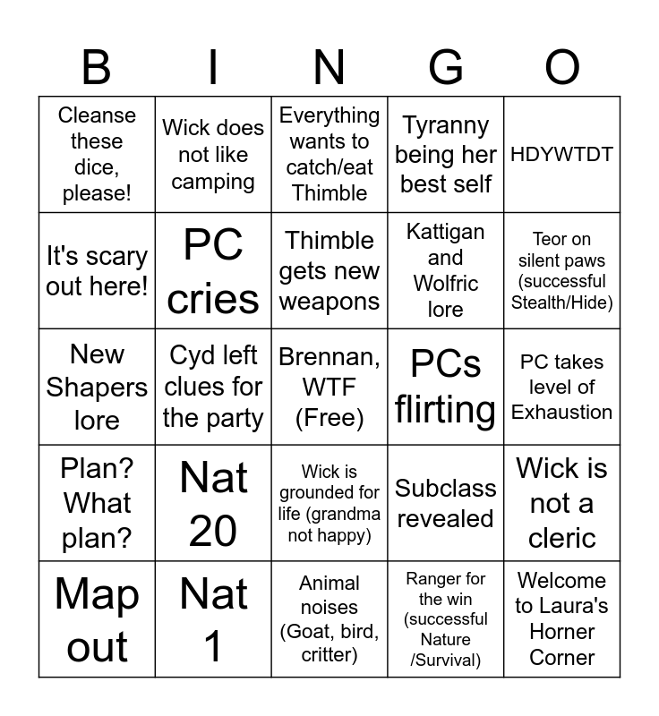 This bingo card has a free space and 24 words: Nat 20, Nat 1, Thimble gets new weapons, Map out, HDYWTDT, Cleanse these dice, please!, It's scary out here!, Wick does not like camping, PCs flirting, Wick is grounded for life (grandma not happy), Kattigan and Wolfric lore, New Shapers lore, Subclass revealed, Wick is not a cleric, PC cries, Ranger for the win (successful Nature /Survival), PC takes level of Exhaustion, Everything wants to catch/eat Thimble, Teor on silent paws (successful Stealth/Hide), Cyd left clues for the party, Welcome to Laura's Horner Corner, Plan? What plan?, Tyranny being her best self and Animal noises (Goat, bird, critter).