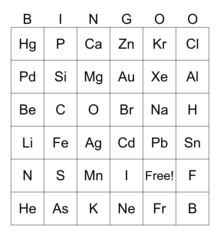 This bingo card has 37 words: Free!, I, Fr, Pd, Fe, Na, Si, Ne, Kr, He, Al, Zn, Be, O, Cl, Br, S, Ca, H, C, Hg, Au, Ag, Pb, As, Sn, P, K, F, Mn, Co, Cd, Xe, N, Li, Mg and B.