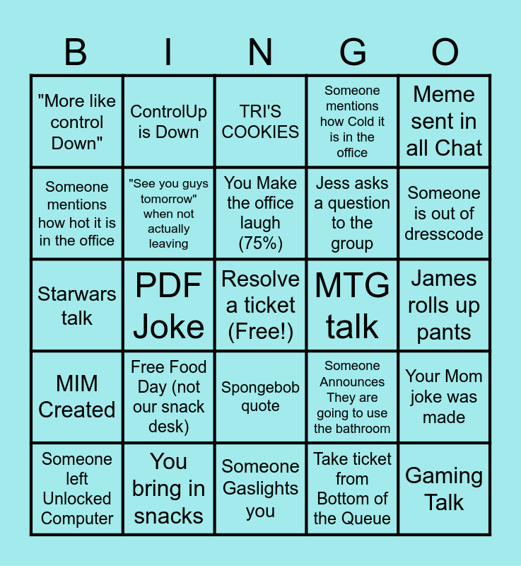 This bingo card has a free space and 57 words: 67 Joke, Someone left Unlocked Computer, Talking about gooning, "More like control Down", Someone Gaslights you, Deez Nuts Joke, "See you guys tomorrow" when not actually leaving, Character Voice, Jess asks a question to the group, Not recieving nicks attention, Someone mentions how Cold it is in the office, Make fun of a users name, Someone Repeats a story they told before, Flirting with a Co-Worker, RJ's "HMMMMMMM", You are Matching clothes 50%+ with someone else, Meme sent in all Chat, PDF Joke, Politics talk, Gaming Talk, MTG talk, Someone sings a song, Someone Announces They are going to use the bathroom, TRI'S COOKIES, Someone's Joke doesnt land, You Make the office laugh (75%), Jan or Tiny man voluntarily visit the desk, Someone chimed into a convo they werent a part of, Someone is out of dresscode, You get an annoying user on the phone, David Visits the desk, Complaining about Fantasy Football, Someone shares a clip with the group, You Get 30+ tickets for the day done, James rolls up pants, Someone mentions how hot it is in the office, Someone Throws a ball, Starwars talk, LOTR talk, MIM Created, ControlUp is Down, Spongebob quote, Your Internet goes out, Queue 25+, Rasict Joke, RJ blessing himself when sneezing, Free Food Day (not our snack desk), You bring in snacks, Tri voluntarily Visits Desk, You wait more than 2 hours for FS to respond, Being ragebaited, Take ticket from Bottom of the Queue, Survey with Comment (auto bingo if the comment is how bad you are), Steal a ticket from Callisto, Jordan gets yelled at by a user, Your Mom joke was made and Someone else starts or finishes the "crazy? i was crazy once" joke.