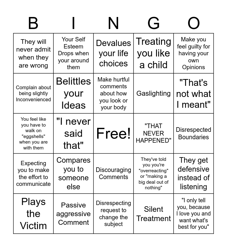 This bingo card has a free space and 24 words: Plays the Victim, Compares you to someone else, Make hurtful comments about how you look or your body, Silent Treatment, Make you feel guilty for having your own Opinions, They will never admit when they are wrong, Your Self Esteem Drops when your around them, Devalues your life choices, "THAT NEVER HAPPENED", Disrespected Boundaries, You feel like you have to walk on "eggshells" when you are with them, Belittles your Ideas, They've told you you're "overreacting" or "making a big deal out of nothing", They get defensive instead of listening, Complain about being slightly Inconvenienced, Passive aggressive Comment, Disrespecting request to change the subject, Treating you like a child, "That's not what I meant", Expecting you to make the effort to communicate, "I never said that", Discouraging Comments, Gaslighting and "I only tell you, because I love you and want what's best for you".