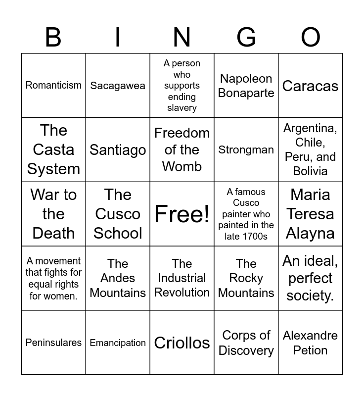 This bingo card has a free space and 24 words: The Andes Mountains, Emancipation, Freedom of the Womb, Peninsulares, Caracas, Romanticism, The Casta System, Sacagawea, A famous Cusco painter who painted in the late 1700s, The Industrial Revolution, Strongman, War to the Death, The Rocky Mountains, An ideal, perfect society., Santiago, Corps of Discovery, Maria Teresa Alayna, A person who supports ending slavery, Argentina, Chile, Peru, and Bolivia, The Cusco School, Alexandre Petion, A movement that fights for equal rights for women., Napoleon Bonaparte and Criollos.