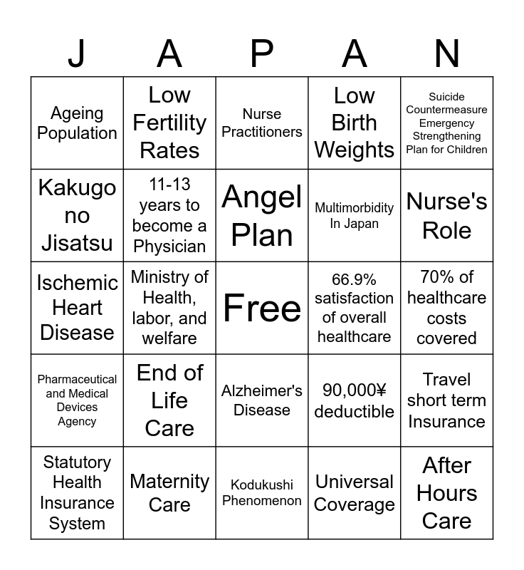 This bingo card has a free space and 24 words: End of Life Care, Maternity Care, Angel Plan, Statutory Health Insurance System, Suicide Countermeasure Emergency Strengthening Plan for Children, Ageing Population, Kakugo no Jisatsu, Low Fertility Rates, 66.9% satisfaction of overall healthcare, Alzheimer's Disease, Multimorbidity In Japan, Ischemic Heart Disease, 90,000¥ deductible, Travel short term Insurance, 11-13 years to become a Physician, Universal Coverage, 70% of healthcare costs covered, Nurse Practitioners, Nurse's Role, Ministry of Health, labor, and welfare, After Hours Care, Pharmaceutical and Medical Devices Agency, Low Birth Weights and Kodukushi Phenomenon.