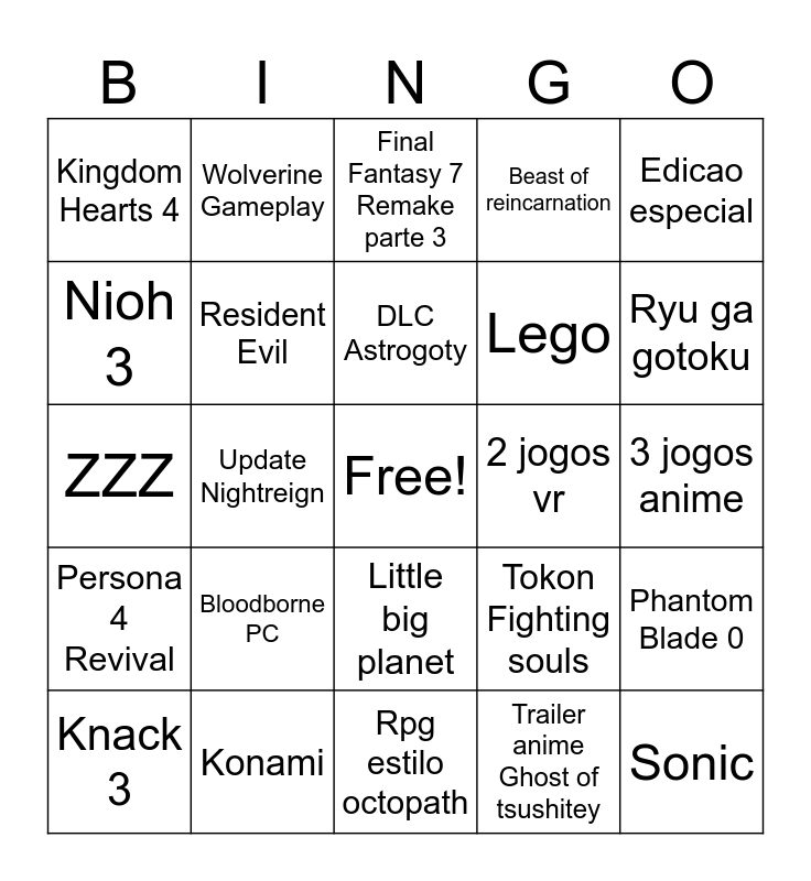 This bingo card has a free space and 24 words: Knack 3, Bloodborne PC, DLC Astrogoty, Trailer anime Ghost of tsushitey, Edicao especial, Kingdom Hearts 4, Wolverine Gameplay, Final Fantasy 7 Remake parte 3, 2 jogos vr, 3 jogos anime, ZZZ, Resident Evil, Tokon Fighting souls, Phantom Blade 0, Nioh 3, Konami, Rpg estilo octopath, Beast of reincarnation, Ryu ga gotoku, Persona 4 Revival, Update Nightreign, Little big planet, Lego and Sonic.