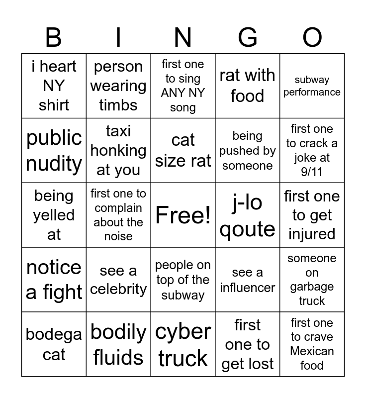 This bingo card has a free space and 24 words: see a celebrity, bodily fluids, cat size rat, bodega cat, subway performance, i heart NY shirt, public nudity, person wearing timbs, j-lo qoute, people on top of the subway, being pushed by someone, being yelled at, see a influencer, someone on garbage truck, taxi honking at you, first one to get lost, first one to get injured, first one to sing ANY NY song, first one to crack a joke at 9/11, first one to complain about the noise, first one to crave Mexican food, notice a fight, rat with food and cyber truck.