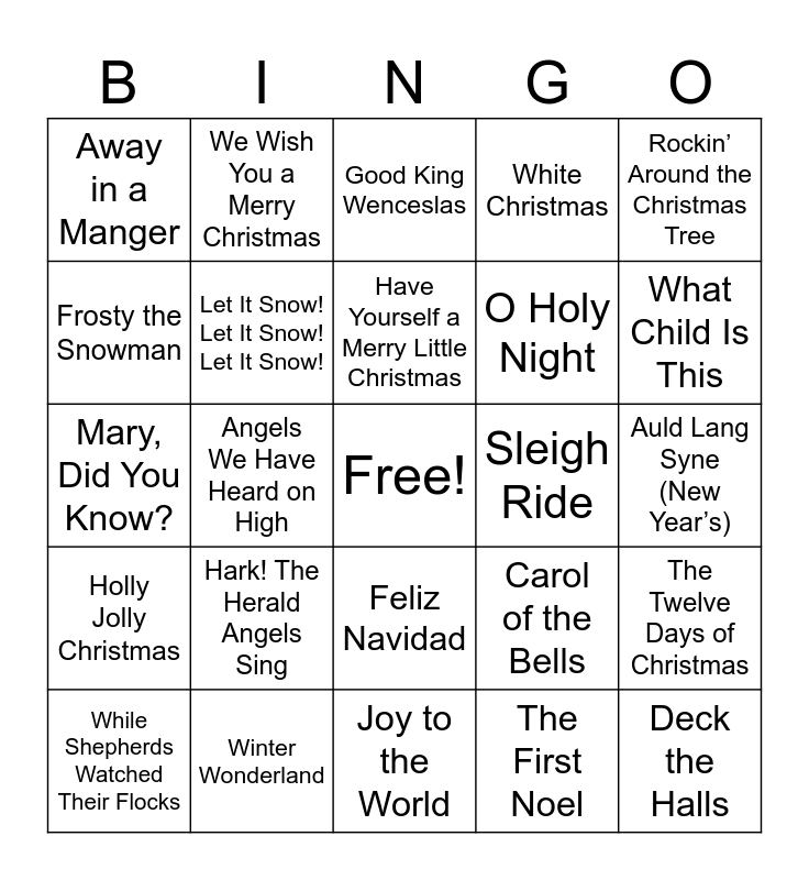 This bingo card has a free space and 51 words: Jingle Bells, Deck the Halls, Silent Night, Joy to the World, Hark! The Herald Angels Sing, O Christmas Tree, We Wish You a Merry Christmas, Rudolph the Red-Nosed Reindeer, Frosty the Snowman, Santa Claus Is Coming to Town, Let It Snow! Let It Snow! Let It Snow!, White Christmas, The Twelve Days of Christmas, Carol of the Bells, Here Comes Santa Claus, It’s Beginning to Look a Lot Like Christmas, Have Yourself a Merry Little Christmas, Sleigh Ride, Jingle Bell Rock, Rockin’ Around the Christmas Tree, Angels We Have Heard on High, The First Noel, Away in a Manger, O Holy Night, O Come, O Come, Emmanual, O Come, All Ye Faithful, What Child Is This, God Rest Ye Merry, Gentlemen, While Shepherds Watched Their Flocks, Good King Wenceslas, Coventry Carol, It Came Upon the Midnight Clear, ding dong merrily on high, The Dreidel Song (I Have a Little Dreidel), Walking in a Winter Wonderland, Winter Wonderland, In the Bleak Midwinter, Hot Chocolate (from The Polar Express), Do You Want to Build a Snowman?, Let It Go (Frozen), Auld Lang Syne (New Year’s), Holly Jolly Christmas, The Christmas Song (Chestnuts Roasting…), Blue Christmas, Mele Kalikimaka, Silver Bells, Mary, Did You Know?, Do You Hear What I Hear?, I’ll Be Home for Christmas, Feliz Navidad and Little Drummer Boy.