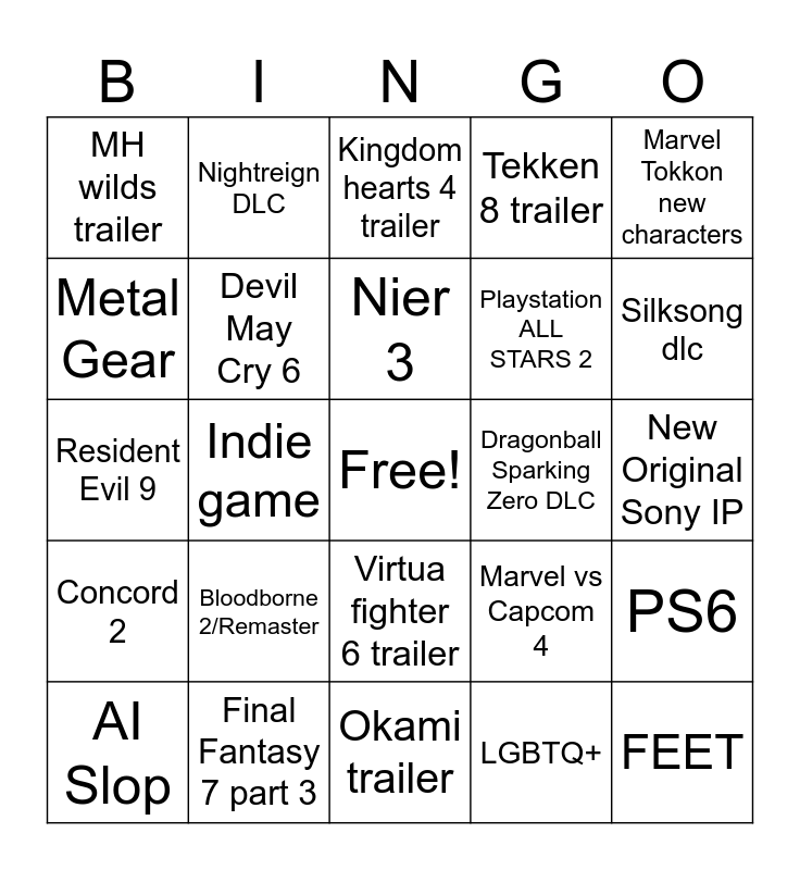 This bingo card has a free space and 24 words: Bloodborne 2/Remaster, Final Fantasy 7 part 3, Nier 3, AI Slop, Marvel Tokkon new characters, MH wilds trailer, Metal Gear, Nightreign DLC, Dragonball Sparking Zero DLC, Virtua fighter 6 trailer, Playstation ALL STARS 2, Resident Evil 9, Marvel vs Capcom 4, PS6, Devil May Cry 6, LGBTQ+, New Original Sony IP, Kingdom hearts 4 trailer, Silksong dlc, Indie game, FEET, Concord 2, Tekken 8 trailer and Okami trailer.