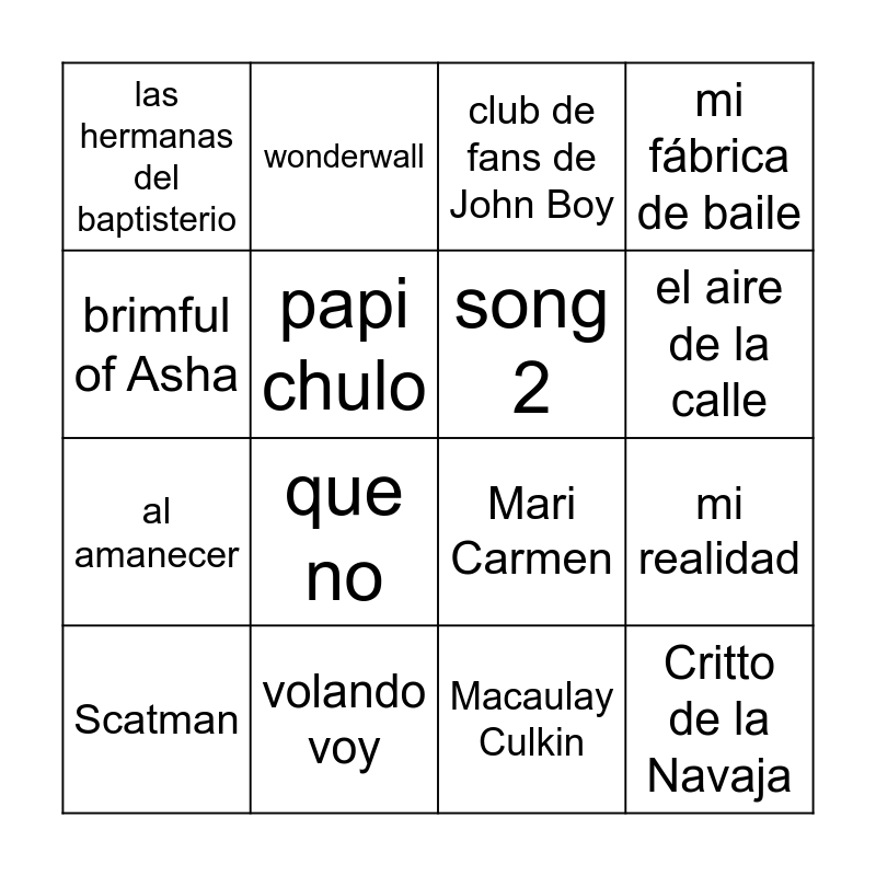 This bingo card has 91 words: Free!, killing in the name, bolillón, nos vamos pal keli, que fue del siglo XX, viejoven, ese loco material, take me out, Dolores se llamaba Lola, Cayetano, los perros, verbena, disfraz de tigre, Macaulay Culkin, cotton eye Joe, el aire de la calle, so payaso, las niñas de La Saye, opa yo viaze un corra, y cuanto más acelero, miña terra galega, Joselito, un buen día, el roce de tu cuerpo, Mari Carmen, aquí no hay playa, cacho a cacho, necesito respirar, señoras bien, salta!, Cherry Lee, last nite, by the way, Critto de la Navaja, las hermanas del baptisterio, mi fábrica de baile, club de fans de John Boy, valiente, mi realidad, que no, años 80, papi chulo, ven, ven, ven, me gusta el futbol, what you know, delgadito, la revolución sexual, ¡mira una moderna!, one more time, hey boy hey girl, torero, al amanecer, confusion!, the final countdown, el vals del obrero, everybody, volando voy, cuando zarpa el amor, toxic, wannabe, 20 de abril, Eloise, toro, Marta, Sebas, Guille y los demás, p’aquí p’allá, zapatillas, mi gato, probe Miguel, la bilirrubina, tiburón, el venao, Scatman, Ecuador, freed from desire, wonderwall, song 2, seven nation army, somebody told me, train, chup chup, puto, brimful of Asha, loser, soy español, pero tengo un kebab, down, son de amores, clavado en un bar, mi tierra, escándalo, Sevilla and cuando vuelva a Sevilla en primavera.
