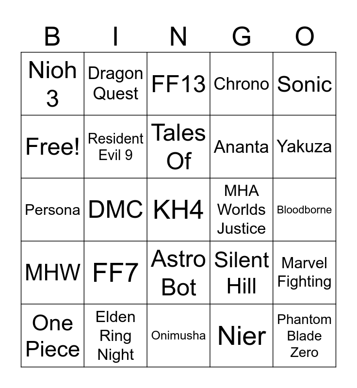 This bingo card has a free space and 24 words: FF7, Elden Ring Night, Tales Of, One Piece, Sonic, Nioh 3, Free!, Dragon Quest, MHA Worlds Justice, Astro Bot, Ananta, Persona, Silent Hill, Marvel Fighting, Resident Evil 9, Nier, Bloodborne, FF13, Yakuza, DMC, Phantom Blade Zero, MHW, Chrono and Onimusha.