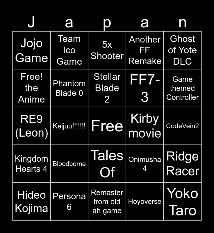 This bingo card has a free space and 24 words: Bloodborne, Persona 6, Stellar Blade 2, Hideo Kojima, Ghost of Yote DLC, Jojo Game, Free! the Anime, Team Ico Game, Kirby movie, Tales Of, FF7-3, RE9 (Leon), Onimusha 4, Ridge Racer, Phantom Blade 0, Hoyoverse, CodeVein2, 5x Shooter, Game themed Controller, Keijuu!!!!!!!, Yoko Taro, Kingdom Hearts 4, Another FF Remake and Remaster from old ah game.