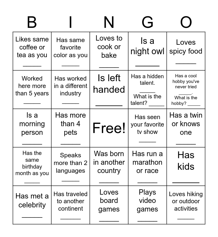 This bingo card has a free space and 24 words: Speaks more than 2 languages _____, Has traveled to another continent ______, Is left handed _____, Has met a celebrity _____, Loves spicy food _____, Likes same coffee or tea as you _____, Worked here more than 5 years _____, Has same favorite color as you _____, Has seen your favorite tv show _____, Was born in another country _____, Has a hidden talent. _____ What is the talent? _____, Is a morning person _____, Has run a marathon or race _____, Has kids _____, Has worked in a different industry _____, Plays video games _____, Has a twin or knows one _____, Loves to cook or bake _____, Has a cool hobby you've never tried _____. What is the hobby? _____, Has more than 4 pets _____, Loves hiking or outdoor activities _____, Has the same birthday month as you _____, Is a night owl _____ and Loves board games _____.